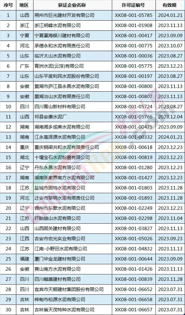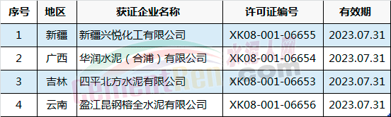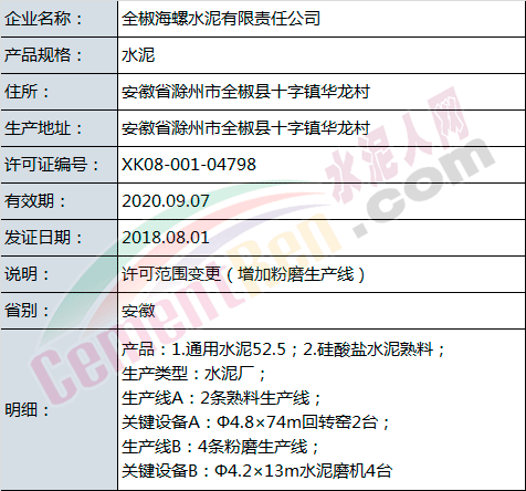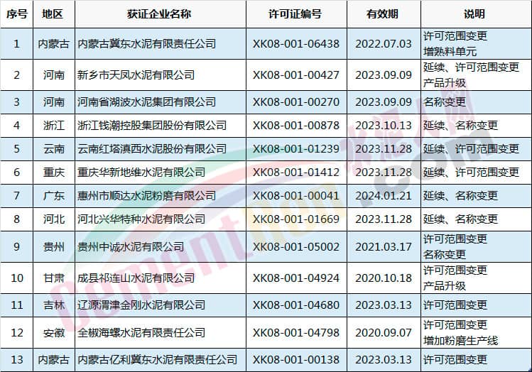 許可范圍變更同時產(chǎn)品升級的有新鄉(xiāng)市天鳳水泥有限公司和成縣祁連山水泥有限公司。涉及名稱變更的共有5家企業(yè),分別為河南省湖波水泥集團有限公司、浙江錢潮控股集團股份有限公司、惠州市順達水泥粉磨有限公司、河北興華特種水泥有限公司和貴州中誠水泥有限公司。