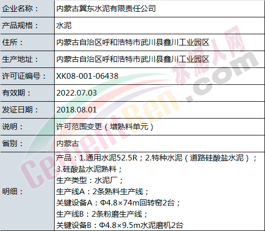 變更項目中,涉及許可范圍變更的共有9家企業(yè),其中內(nèi)蒙古冀東水泥有限責任公司增加熟料單元。增加后: