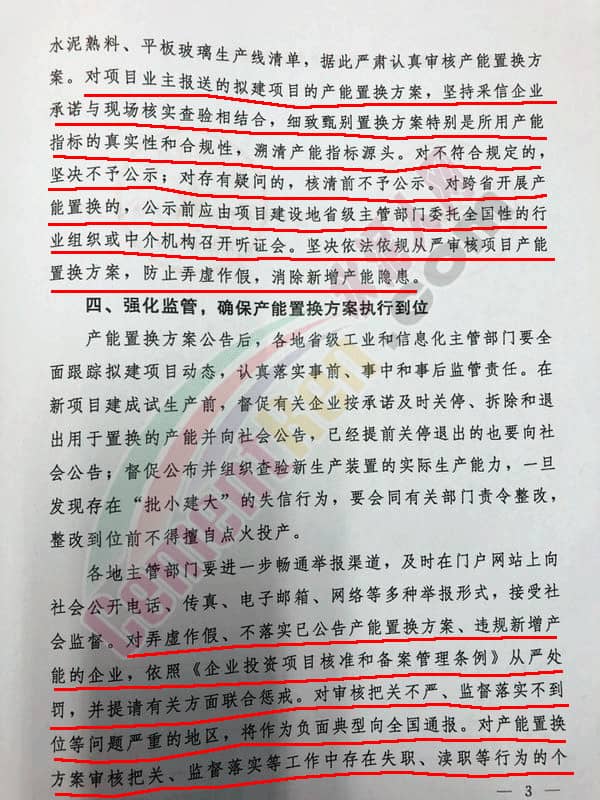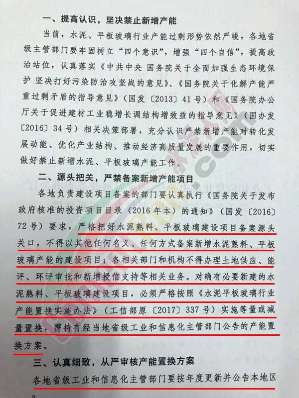 各地省級工業(yè)和信息化主管部門要按年度更新并公告本地區(qū)水泥熟料、平板玻璃生產(chǎn)線清單,據(jù)此嚴(yán)肅認(rèn)真審核產(chǎn)能置換方案。對項(xiàng)目業(yè)主報(bào)送的擬建項(xiàng)目的產(chǎn)能置換方案,堅(jiān)持采信企業(yè)承諾與現(xiàn)場核實(shí)查驗(yàn)相結(jié)合,細(xì)致甄別置換方案特別是所用產(chǎn)能指標(biāo)的真實(shí)性和合規(guī)性,溯清產(chǎn)能指標(biāo)源頭。對不符合規(guī)定的,堅(jiān)決不予公示;對存有疑問的,核清前不予公示。對跨省開展產(chǎn)能置換的,公示前應(yīng)由項(xiàng)目建設(shè)地省級主管部門委托全國性的行業(yè)組織或中介機(jī)構(gòu)召開聽證會。堅(jiān)決依法依規(guī)從嚴(yán)審核項(xiàng)目產(chǎn)能置換方案,防止弄虛作假,消除新增產(chǎn)能隱患。