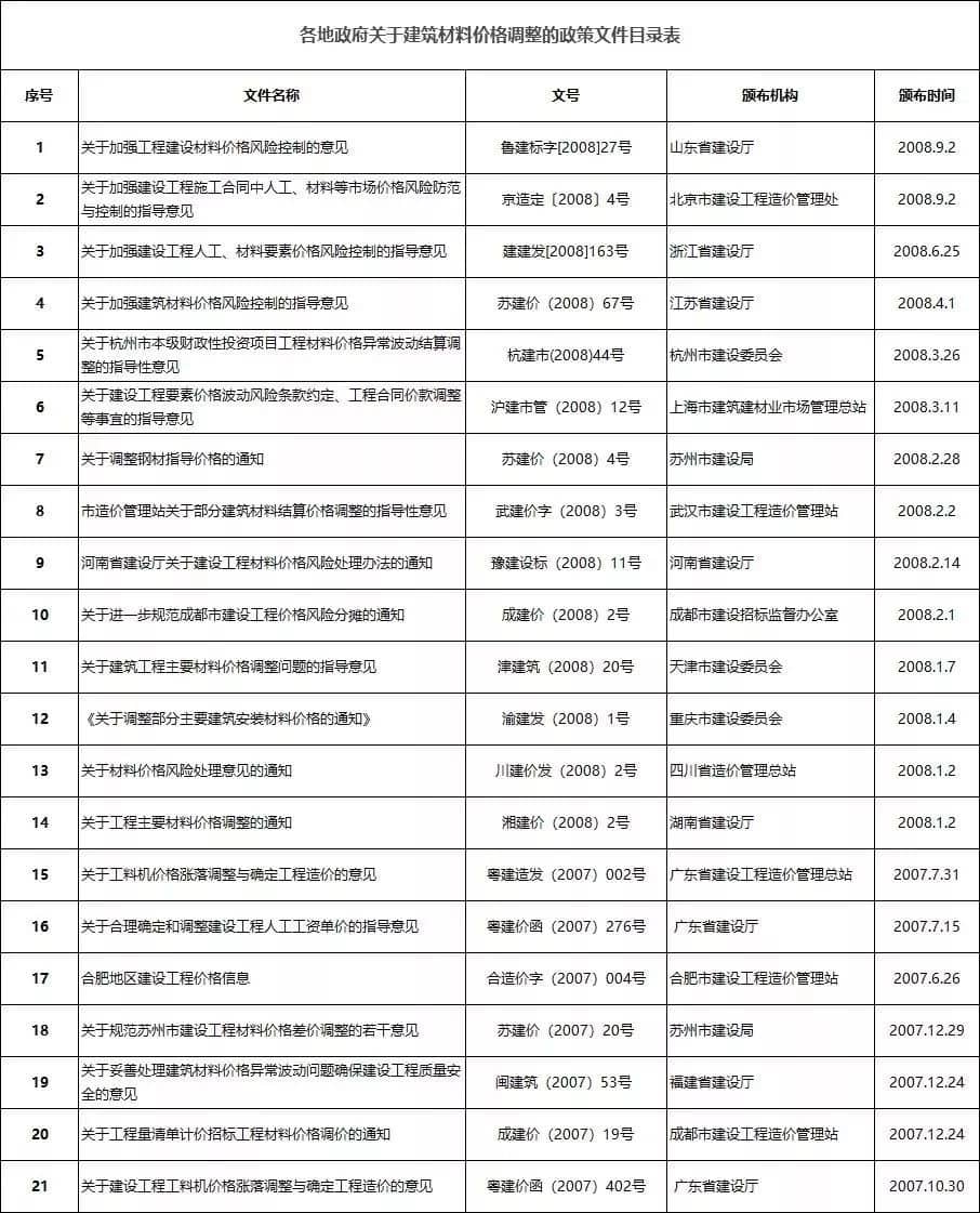 其實早在2007、2008年,因人工、材料(設備)、施工機械臺班價格等出現(xiàn)持續(xù)大幅度的漲落,全國多個省份已出臺文件就這類問題作出明確說明。大多數(shù)地區(qū),在文件中詳細列出了價差調(diào)整的幅度范圍與方法。(因時間跨度較長,下表所列文件可能部分已失效,表中列出僅作參考,不具有實際指導作用!)