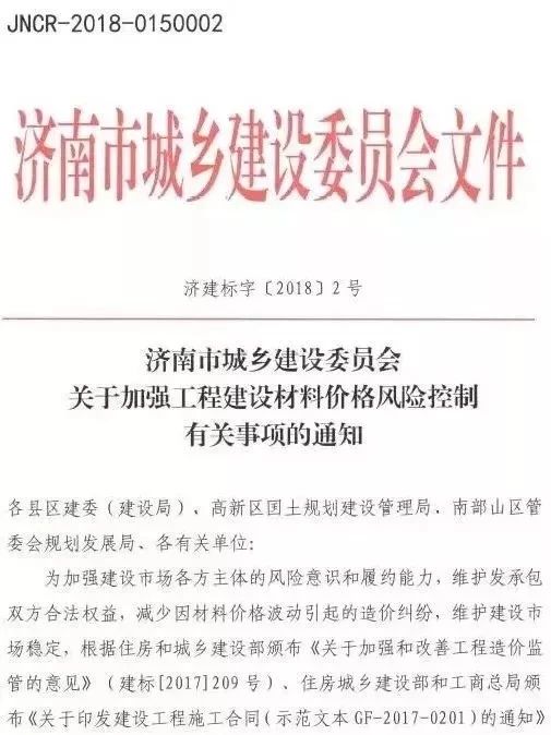 2018年1月30日,濟南市住建委印發(fā)《關(guān)于加強工程建設材料價格風險控制有關(guān)事項的通知》(濟建標字〔2018〕2號),明確工程計價中應推行風險共擔和合理分攤原則,承包人應有限度承擔材料價格等市場風險。