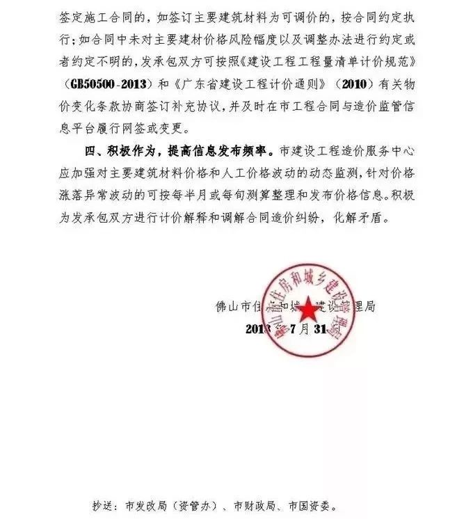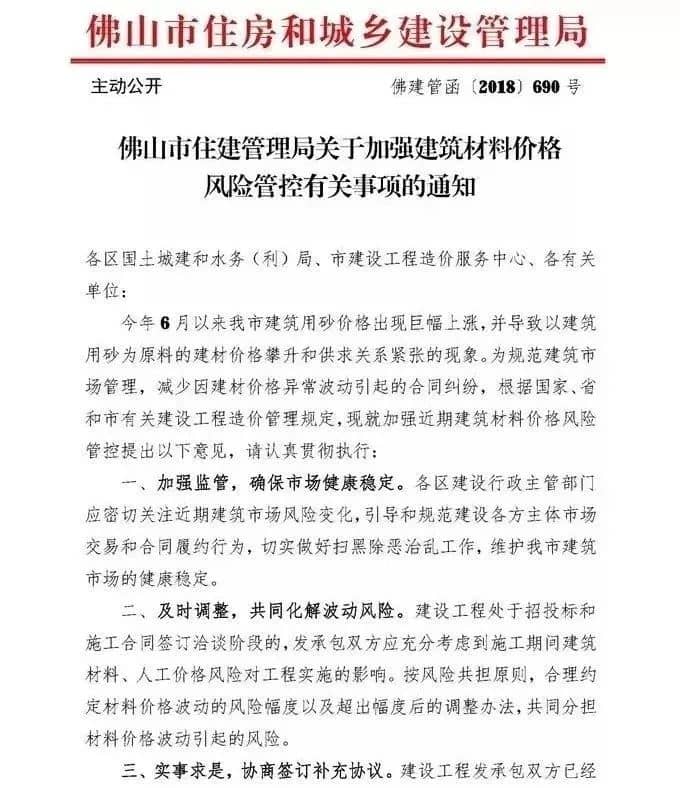 7月31日,佛山市住建管理局下發(fā)了《關(guān)于加強建筑材料價格風險管控有關(guān)事項的通知》,提出: