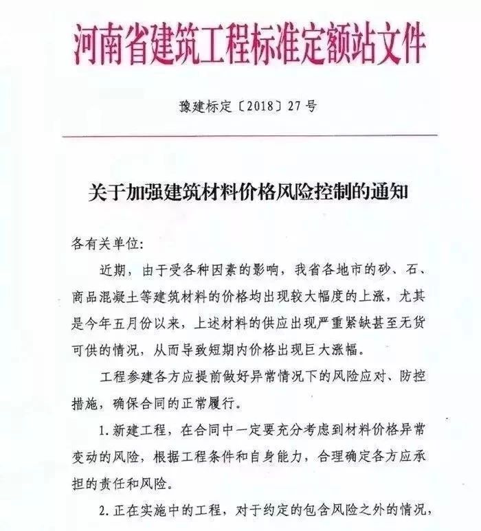 近日,河南省發(fā)布《關(guān)于加強建筑材料價格風險控制的通知》,對工程參建各方提出了應對異常情況的意見。