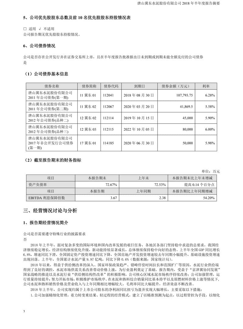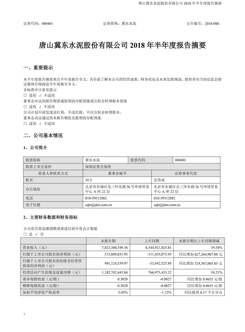 【水泥人網(wǎng)】冀東水泥(000401)8月9日晚發(fā)布半年報(bào),公司上半年?duì)I收78.24億元,同比增長19.54%;凈利5.16億元,同比扭虧,上年同期虧損1.11億元;每股收益0.38元。報(bào)告期,水泥市場供需關(guān)系改善帶動價格上漲。公司水泥和熟料售價及營業(yè)收入與上年同期相比增幅較大,毛利率同比大幅提升。
