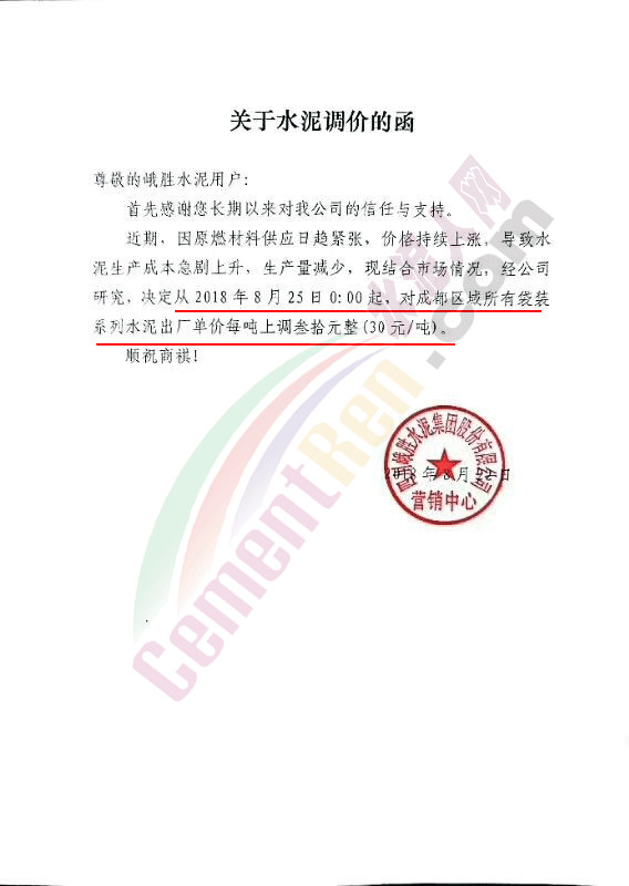 峨勝水泥關(guān)于水泥調(diào)價的函稱,近期因原燃料供應(yīng)日趨緊張,價格持續(xù)上漲,導(dǎo)致水泥生產(chǎn)成本急劇上升,生產(chǎn)量減少,現(xiàn)結(jié)合市場情況,經(jīng)公司研究,決定從2018年8月25日0點起,對成都區(qū)域所有袋裝系列水泥出廠單價每噸上調(diào)30元/噸。