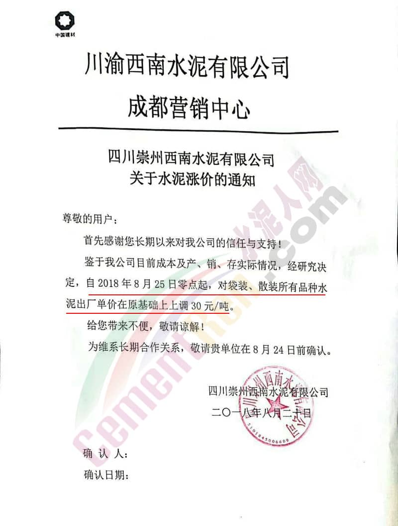 川渝西南水泥有限公司成都營銷中心四川崇州西南水泥有限公司發(fā)布水泥漲價的通知,鑒于公司目前成本及產(chǎn)、銷、存實際情況,經(jīng)研究決定 ,自2018年8月25日零點起,對袋裝、散裝所有品種水泥出廠單價在原基礎(chǔ)上上調(diào)30元/噸。
