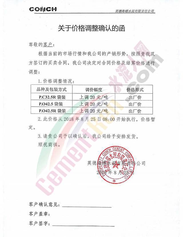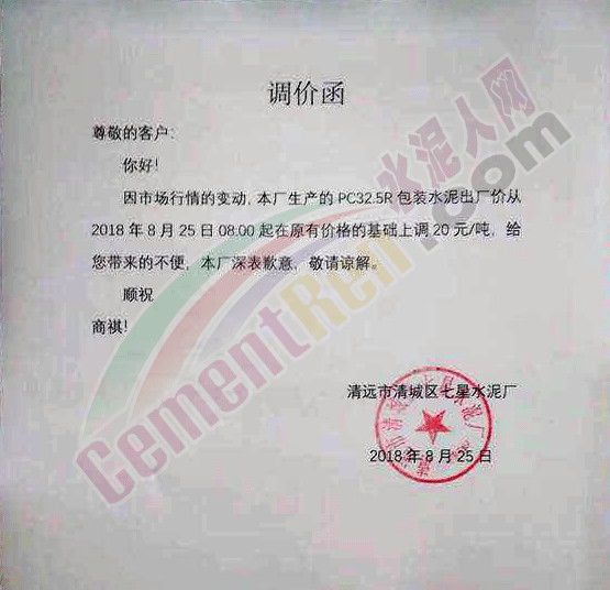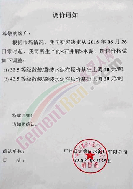 英德海螺、清新海螺、佛山海螺發(fā)布提價通知,自2018年8月25日起各標(biāo)號水泥在原價基礎(chǔ)上上調(diào)20元/噸。