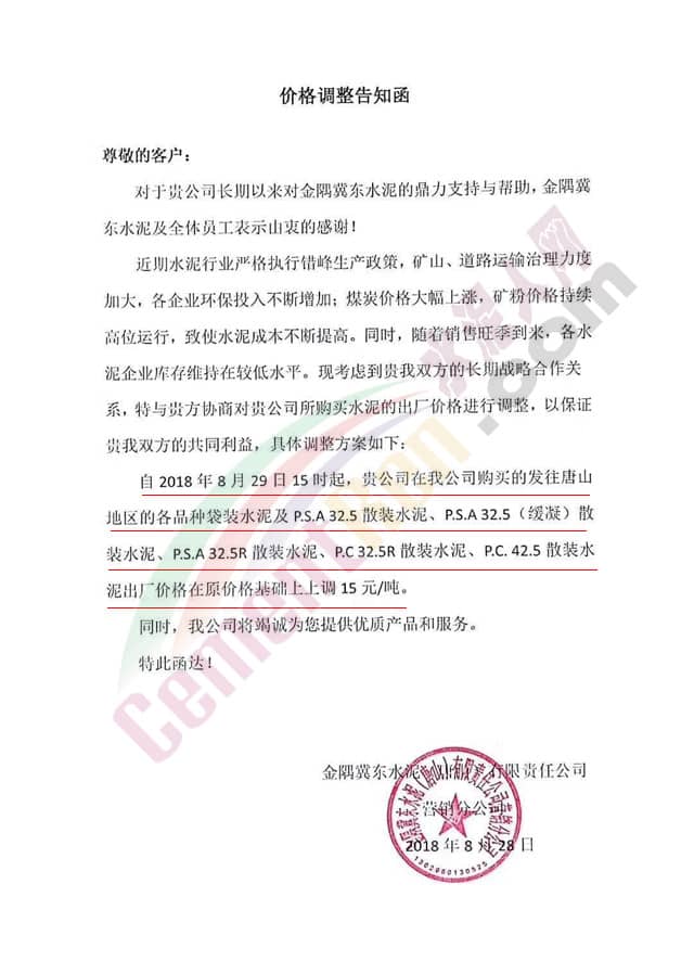 自8月29日15時(shí)起,客戶在公司購(gòu)買的發(fā)往唐山地區(qū)的各品種袋裝水泥及P.S.A 32.5散裝水泥、P.S.A 32.5(緩凝)散裝水泥、P.S.A 32.5R散裝水泥、P.C 32.5R散裝水泥、P.C 42.5散裝水泥出廠價(jià)格上調(diào)15元/噸。