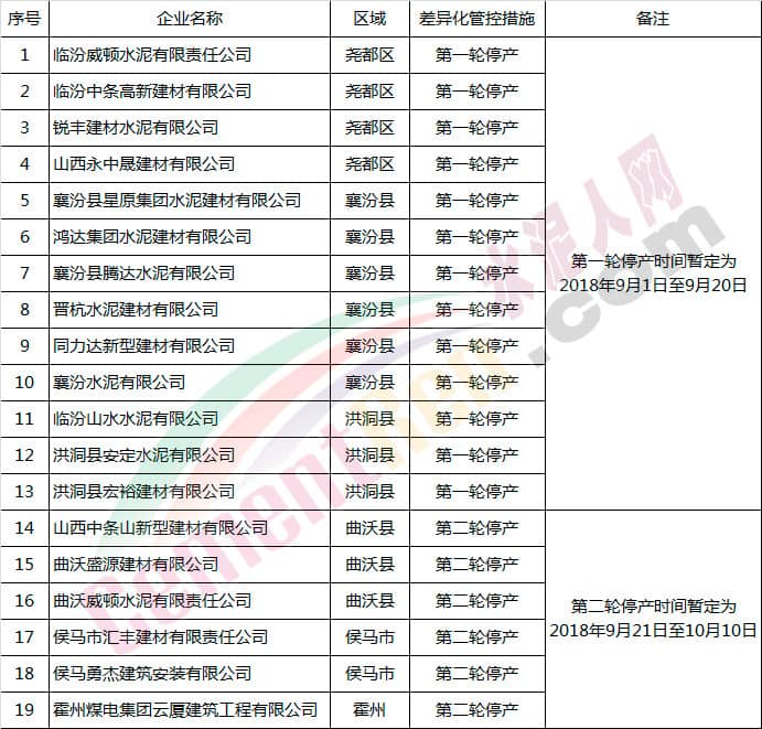 第一輪停產(chǎn)時間暫定為9月1日~9月20日為,管控區(qū)域為堯都區(qū)、襄汾縣、洪洞縣等。