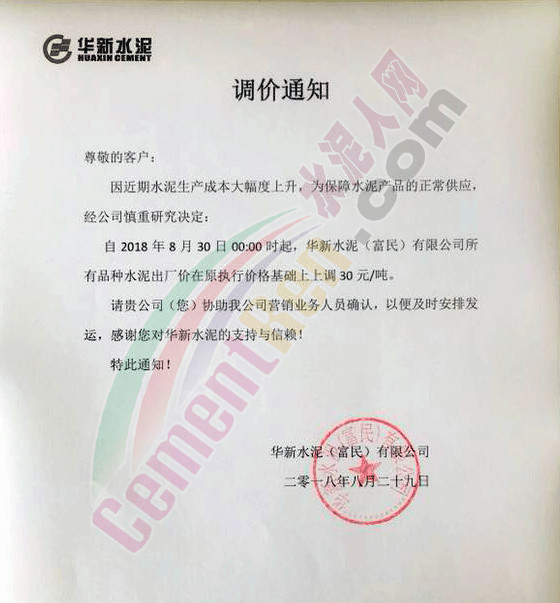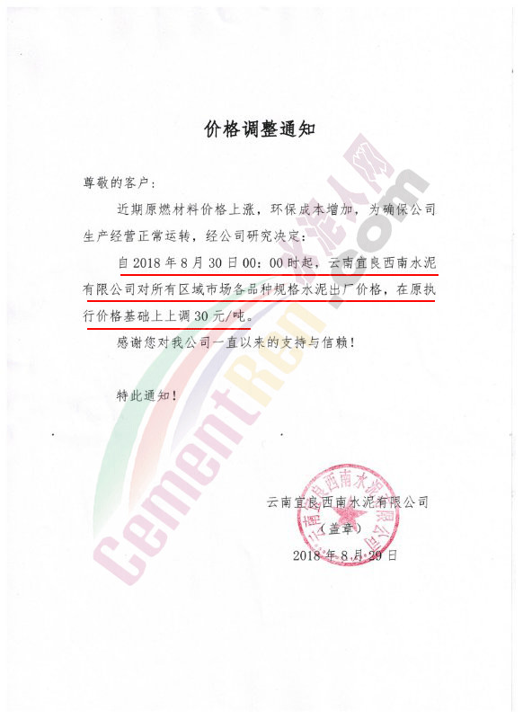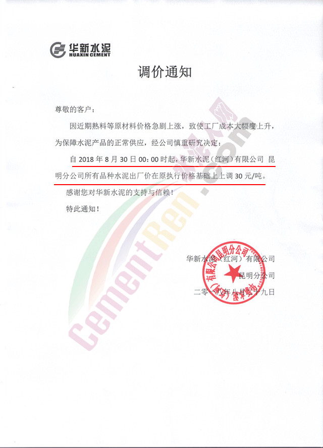 區(qū)域主導企業(yè)華新水泥(紅河)有限公司調(diào)價通知稱,因近期熟料等原材料價格急劇上漲,致使工廠成本大幅度上升,為保障水泥產(chǎn)品的正常供應,經(jīng)公司慎重研究決定,自今日(8月30日)零點起紅河公司 昆明分公司所有品種水泥出廠價在原執(zhí)行價格基礎上上調(diào)30元/噸。