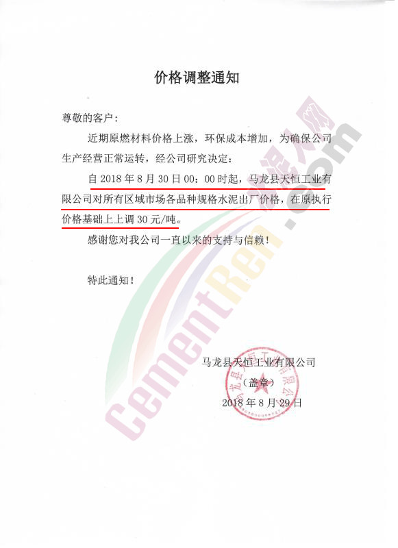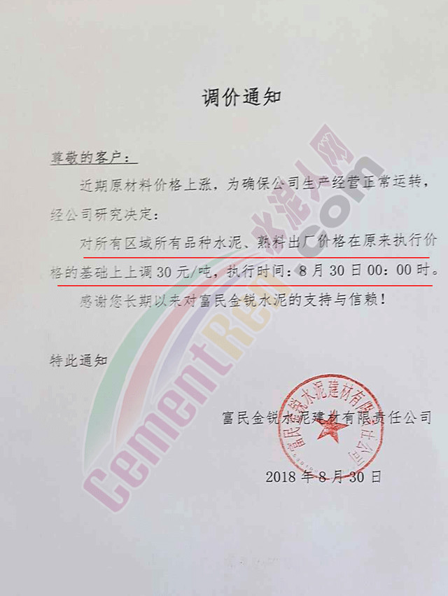 富民金銳水泥建材有限責任公司調(diào)價通知稱:由于近期原材料價格上漲,為確保公司生產(chǎn)經(jīng)營正常運轉(zhuǎn),經(jīng)公司研究決定 ,自今日(8月30日)零時起對所有區(qū)域品種水泥、熟料出廠價格在原執(zhí)行價格基礎上上調(diào)30元/噸。