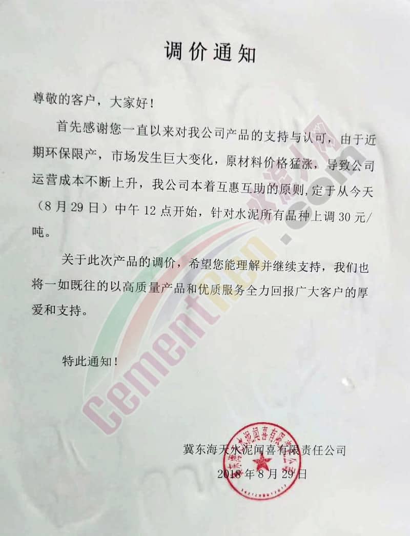 昨日(29日),聞喜冀東也發(fā)布了調(diào)價通知。調(diào)價通知稱,由于近期環(huán)保限產(chǎn),市場發(fā)生巨大變化,原材料價格猛漲,導致公司運營成本不斷上升,定于8月29日中午12點起針對水泥所有品種上調(diào)30元/噸。