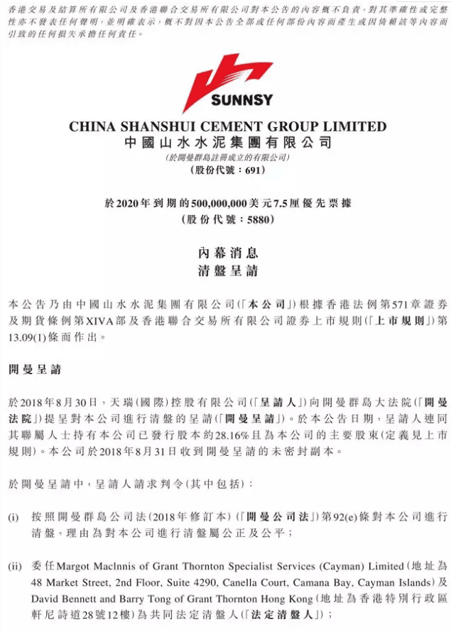 山水水泥(00691)公告,于2018年8月30日,天瑞(國(guó)際)控股有限公司(呈請(qǐng)人)向開曼群島大法院(開曼法院)提呈對(duì)公司進(jìn)行清盤的呈請(qǐng)(開曼呈請(qǐng))。于公告日期,呈請(qǐng)人連同其聯(lián)屬人士持有公司已發(fā)行股本約28.16%且為公司的主要股東。公司于2018年8月31日收到開曼呈請(qǐng)的未密封副本。