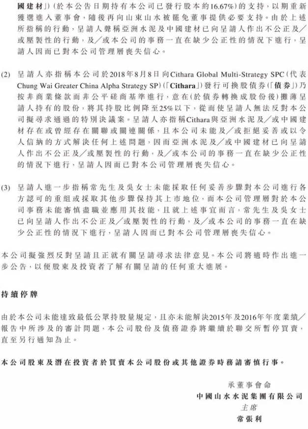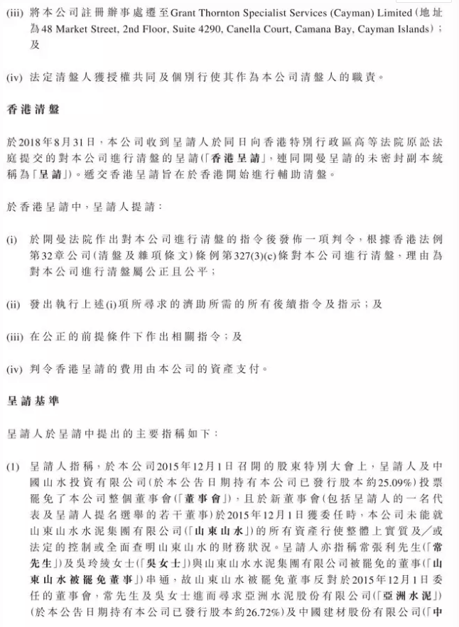 于2018年8月31日,公司收到呈請(qǐng)人于同日向香港特別行政區(qū)高等法院原訟法庭提交的對(duì)公司進(jìn)行清盤的呈請(qǐng)(香港呈請(qǐng))。遞交香港呈請(qǐng)旨在于香港開始進(jìn)行輔助清盤。