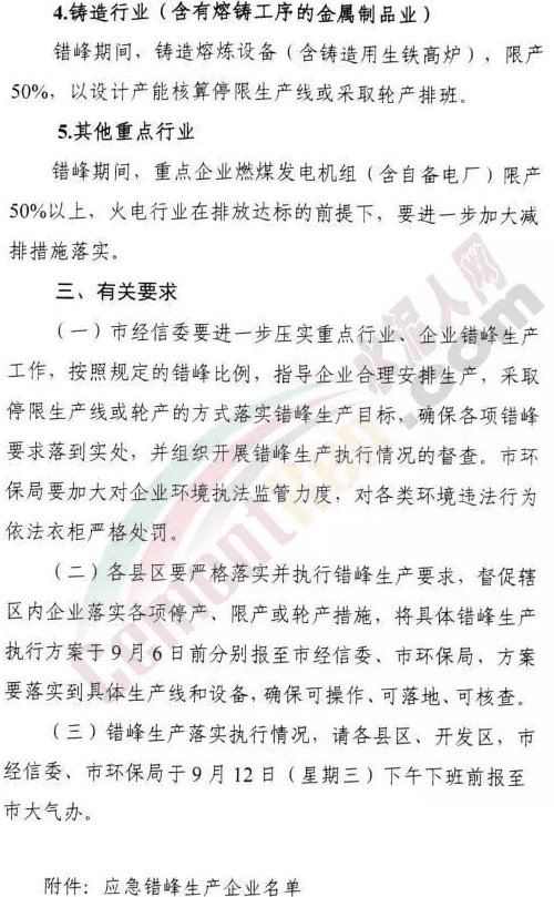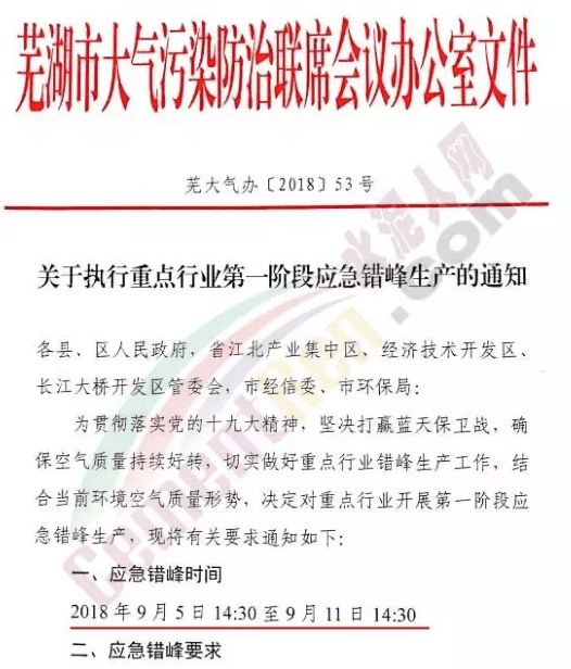 根據(jù)蕪湖市大氣污染防治聯(lián)席會(huì)辦公室日前發(fā)布的《關(guān)于執(zhí)行重點(diǎn)行業(yè)第一階段應(yīng)急錯(cuò)峰生產(chǎn)的通知》顯示,為貫徹落實(shí)黨的十九大精神,堅(jiān)決打贏藍(lán)天保衛(wèi)戰(zhàn),確??諝赓|(zhì)量持續(xù)好轉(zhuǎn),切實(shí)做好重點(diǎn)行業(yè)錯(cuò)峰生產(chǎn)工作,結(jié)合當(dāng)前環(huán)境空氣質(zhì)量形勢(shì),蕪湖市決定對(duì)重點(diǎn)行業(yè)開(kāi)展第一階段應(yīng)急錯(cuò)峰生產(chǎn)。