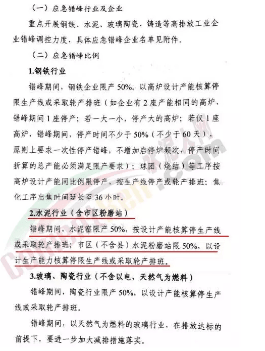 按照文件要求,2018年9月5日14:30至9月11日14:30,重點(diǎn)開(kāi)展水泥等高排放工業(yè)企業(yè)錯(cuò)峰調(diào)控力度,要求錯(cuò)峰期間,水泥窯限產(chǎn)50%,按設(shè)計(jì)產(chǎn)能核算停生產(chǎn)線或采取輪產(chǎn)排班;市區(qū)(不含縣)水泥粉磨站限50%,以設(shè)計(jì)生產(chǎn)能力核算停限生產(chǎn)線或采取輪產(chǎn)排班。