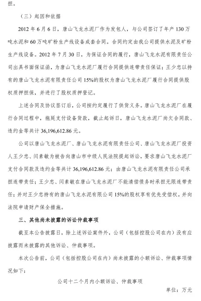 唐山飛龍水泥廠在履行合同過程中,拖延支付設(shè)備貨款,公司請求判令唐山飛龍水泥廠支付公司合同款、違約金等合計3619.66萬元;由唐山飛龍水泥有限責(zé)任公司對上述債務(wù)承擔(dān)連帶清償責(zé)任。