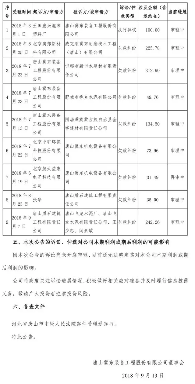 冀東裝備(000856)9月12日晚公告,9月12日,唐山市中級人民法院受理了公司訴唐山飛龍水泥廠、唐山飛龍水泥有限責(zé)任公司、王少忠、閆素敏買賣合同糾紛一案。