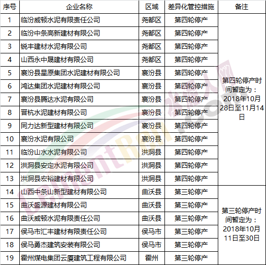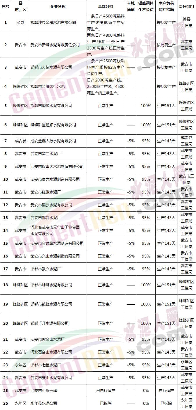 (一)水泥企業(yè)(不含粉磨站)除承擔(dān)居民供暖、協(xié)同處置城市垃圾或危險廢物及高速公路重點建設(shè)項目等保民生任務(wù)的,要根據(jù)承擔(dān)任務(wù)量核定最大允許生產(chǎn)負荷外,其余企業(yè)錯峰期間全部停產(chǎn),在2018年9月底前報邯鄲市人民政府備案。水泥粉磨站按通用指標進行績效評價,最終確定企業(yè)采暖季錯峰生產(chǎn)方案。9月底未按標準驗收合格的企業(yè)停產(chǎn)。