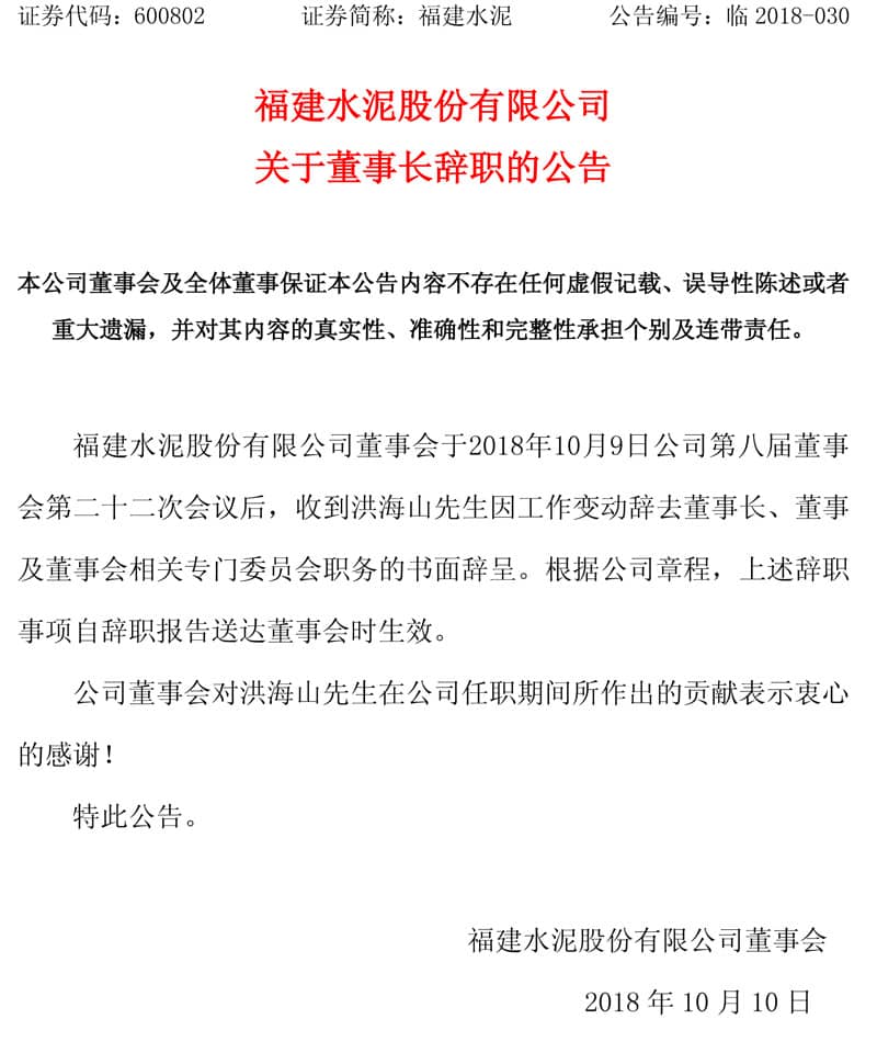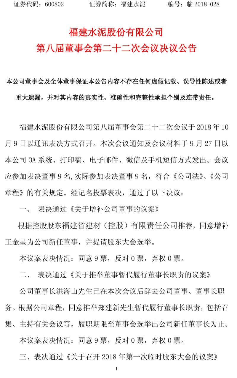 同期,福建水泥股份有限公司第八屆董事會第二十二次會議于2018年10月9日以通訊表決方式召開。經(jīng)記名投票表決,通過了以下決議: