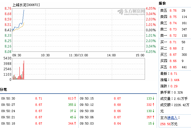 10月10日,上峰水泥盤中快速上漲,5分鐘內(nèi)漲幅超過2%,截至9點(diǎn)50分,報(bào)8.71元,成交2226.42萬元,換手率0.32%。