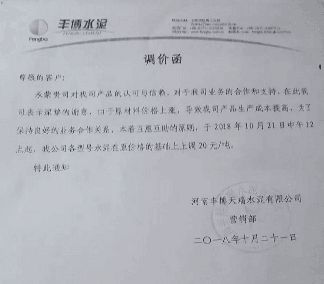 河南省豐博天瑞水泥有限公司在調(diào)價函中決定公司各型號水泥在原價格的基礎(chǔ)上上調(diào)20元/噸。
