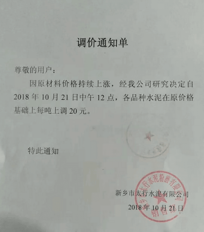 新鄉(xiāng)市太行水泥有限公司在調(diào)價函中決定公司內(nèi)各品種水泥在原價格基礎(chǔ)上每噸上調(diào)20元。
