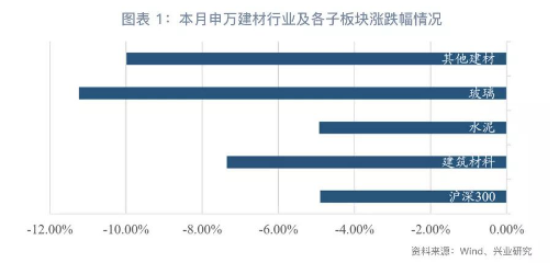 本月大盤持續(xù)表現(xiàn)不佳,滬深300指數(shù)下降4.90%,申萬(wàn)建材指數(shù)下降7.35%,其中水泥板塊下降4.93%,水泥板塊表現(xiàn)出較強(qiáng)韌性。
