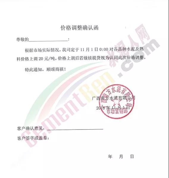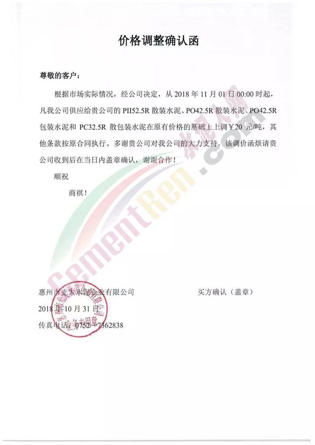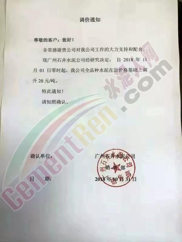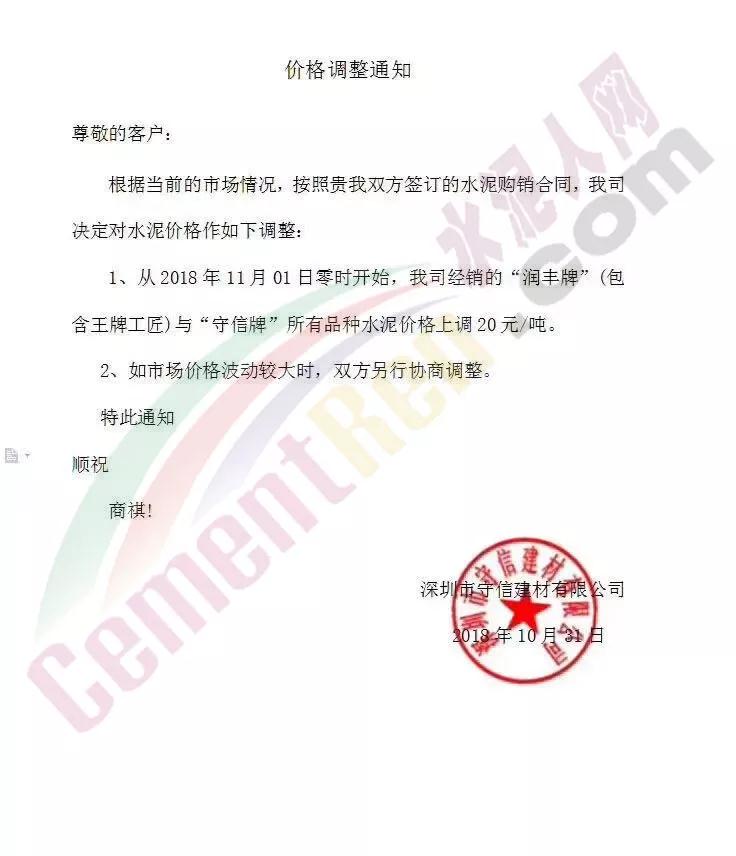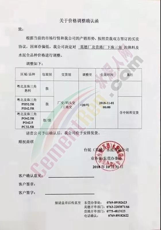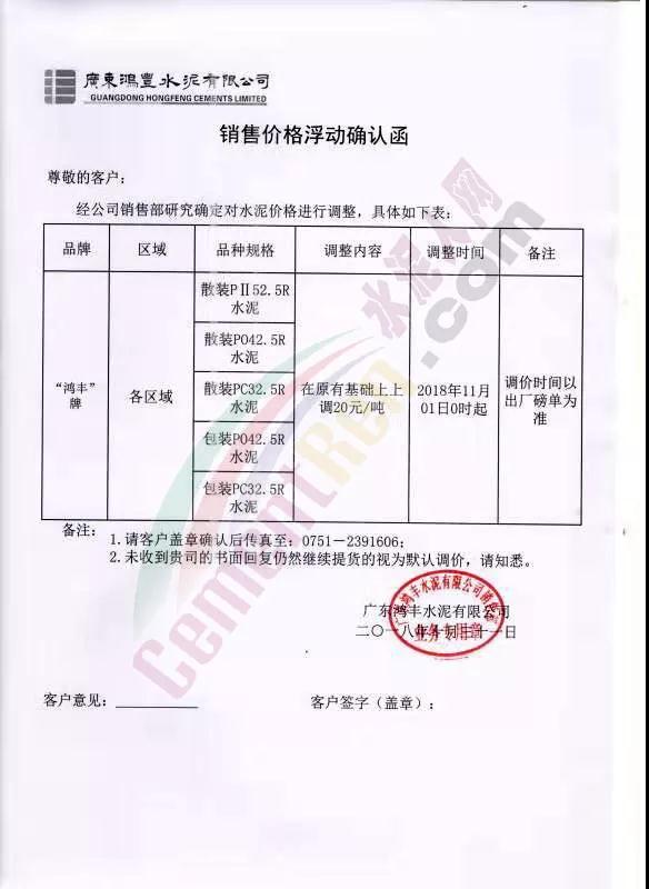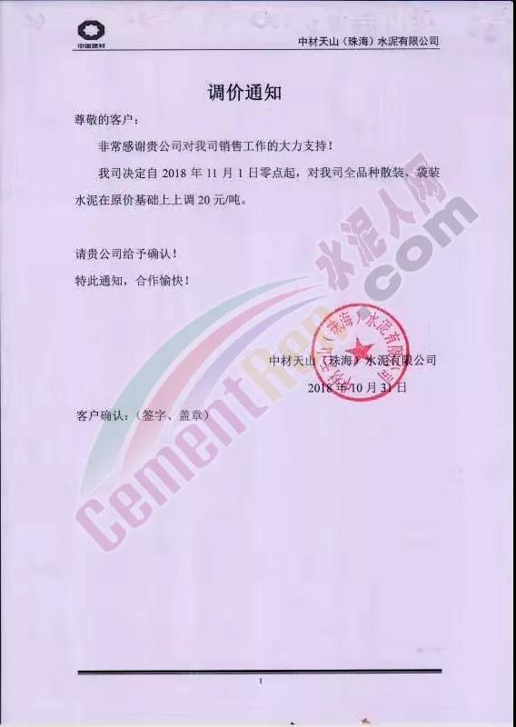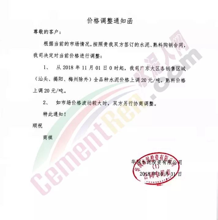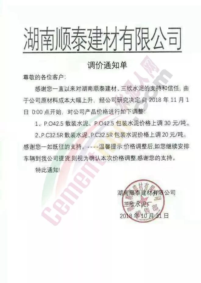 由于原材料價格上漲,公司經營成本上升,結合當前市場行情變化,經公司研究決定于2018年11月1日0:00時開始對隆回區(qū)域各品種水泥、熟料價格上調30元/噸。溫馨提示:價格調整后,如您繼續(xù)安排車輛到我公司提貨,則視為確認本次價格調整,感謝您的支持,特此通知! 【邵陽海螺銷售處】