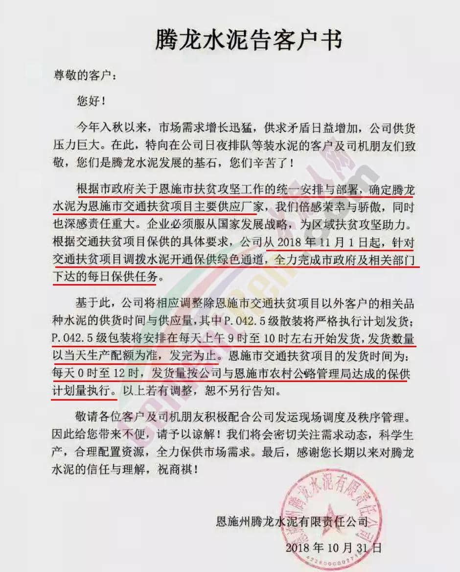 同一天,湖北恩施騰龍水泥告知下游客戶,今年入秋以來市場需求增長迅猛,供求矛盾日益增加,公司供貨壓力巨大。同時,根據(jù)市政府關于恩施市扶貧攻堅工作的統(tǒng)一安排與部署,確定騰龍水泥為恩施市交通扶貧項目主要供應廠家,為保證交通扶貧項目從2018年11月1日起,針對交通扶貧項目調拔水泥開通保供綠色通道,全力完成市政府及相關部門下達的每日保供任務。