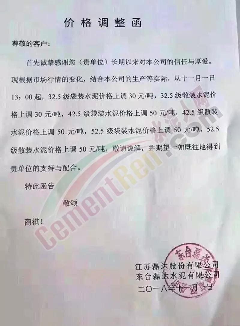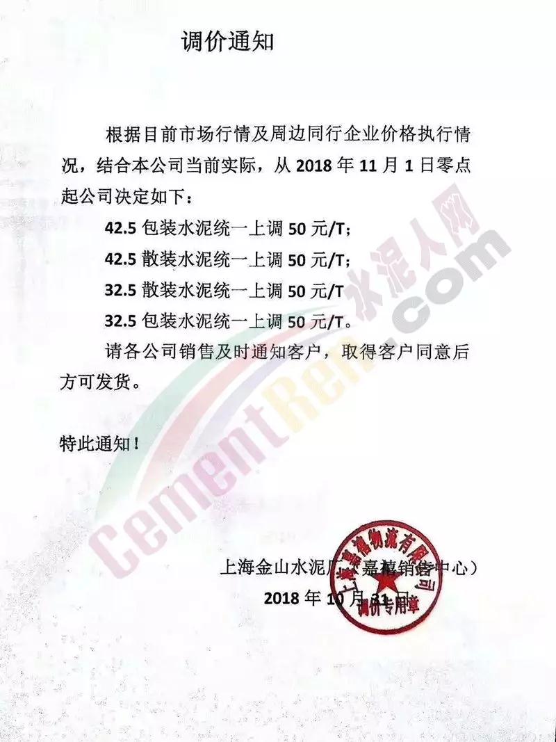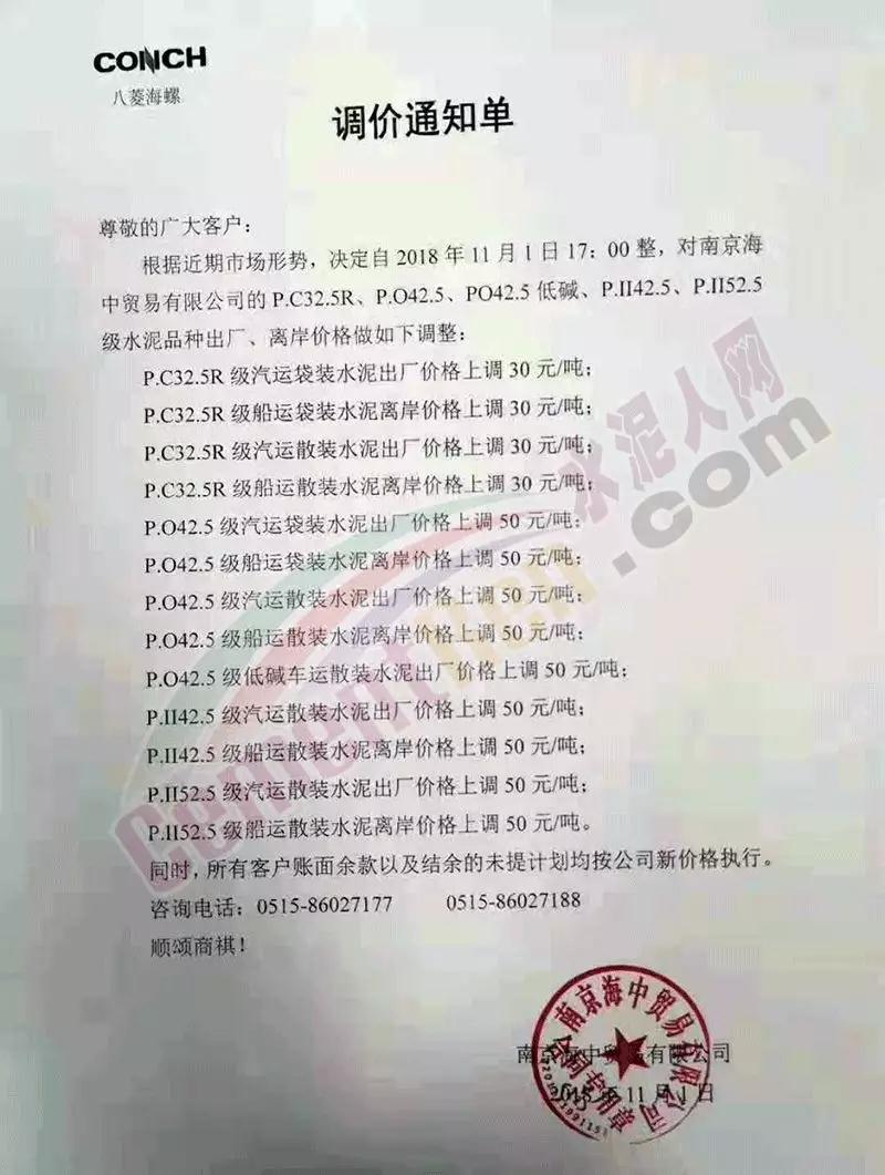 昨日(11月1日)南京海中貿(mào)易公司發(fā)布提價(jià)通知,各標(biāo)號(hào)水泥價(jià)格上調(diào)30-50元/噸。