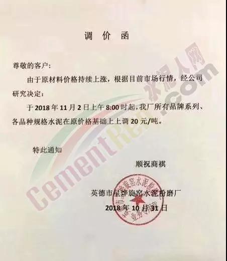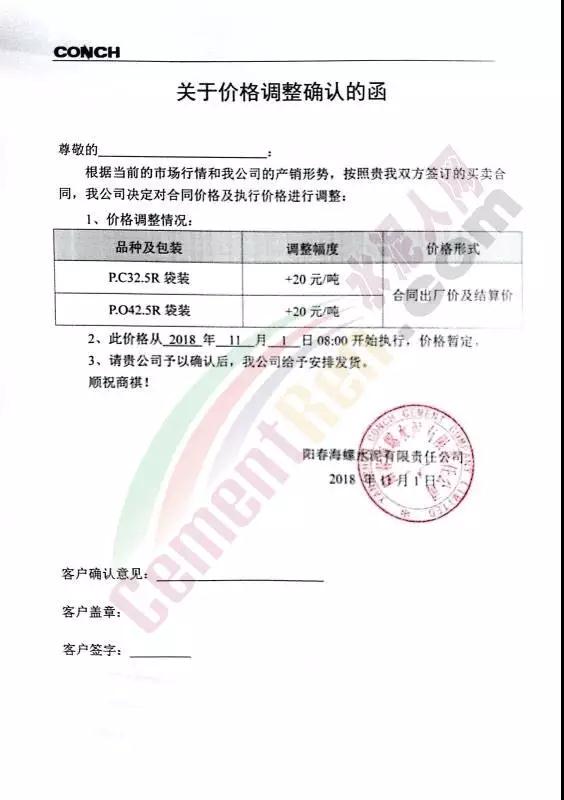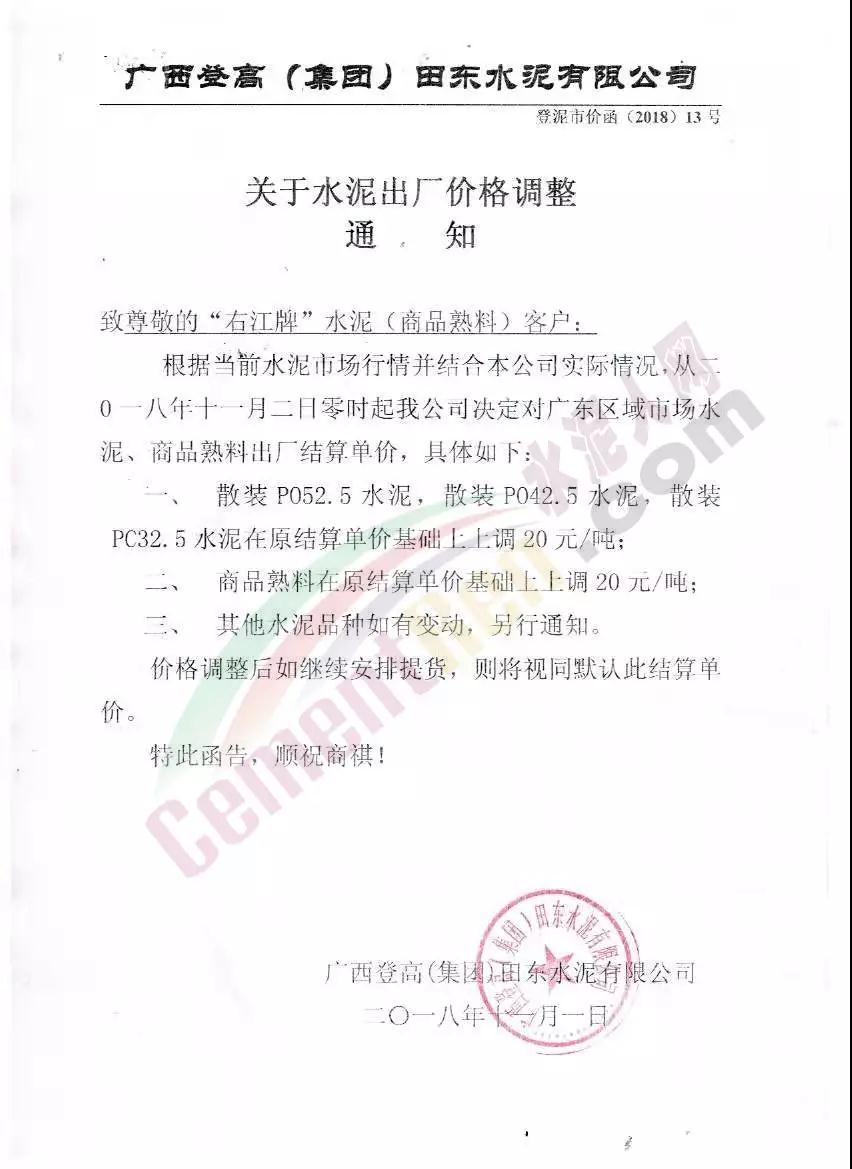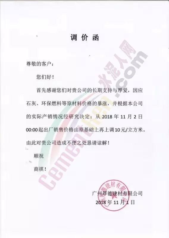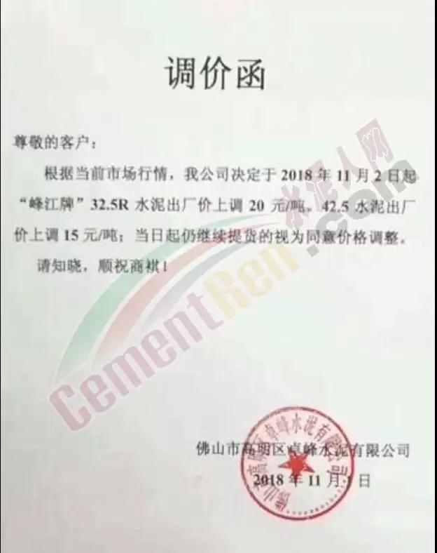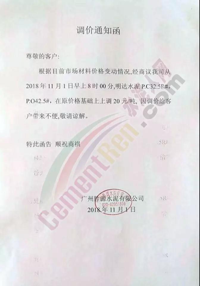 華南區(qū)域廣東、廣西區(qū)域水泥企業(yè)漲價(jià)通知函