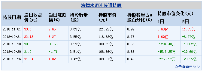 11月01日滬股通成交信息顯示,滬股通資金持有海螺水泥3.63億股,較前一交易日增持745.31萬股,持股市值為121.92億元,較前一交易日增加5.60億元。滬股通持股數(shù)量占流通股本比例為9.07%,占總股本比例為6.85%。