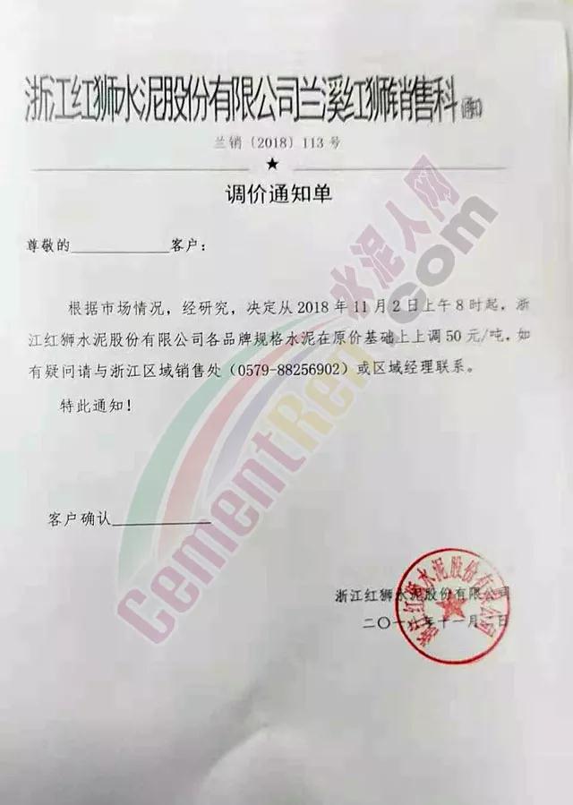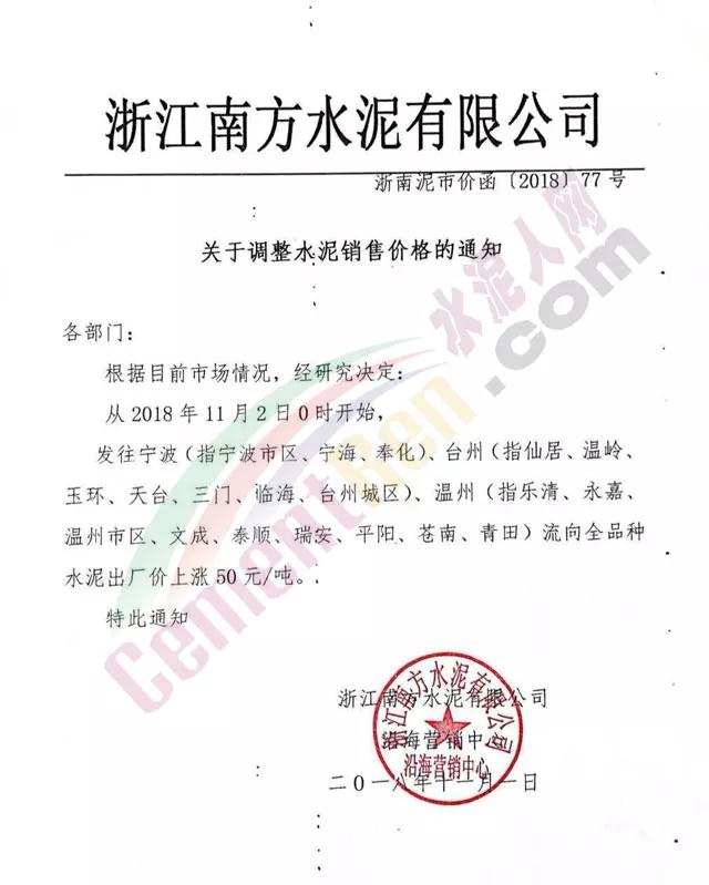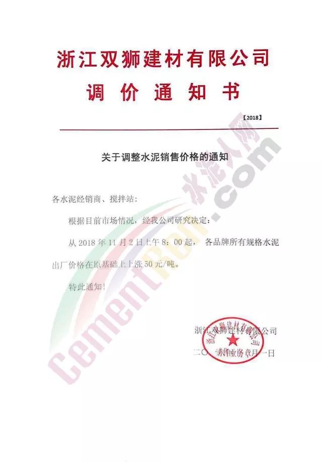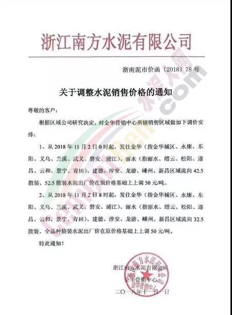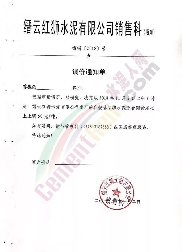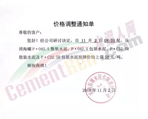 根據(jù)當(dāng)前錯(cuò)峰生產(chǎn)、市場行情及原材料價(jià)格上漲情況,經(jīng)公司研究決定,自2018年11月2日上午8時(shí)起,對(duì)PC32.5袋裝及散裝價(jià)格上調(diào)30元/噸;PO42.5袋、散裝、緩凝及52.5袋、散上調(diào)50元/噸。