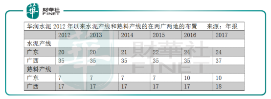 類似于海螺水泥在長江沿岸、華東地區(qū)的T型戰(zhàn)略,華潤水泥也同樣通過運用廣西地區(qū)較廣東更為豐富的石灰石和煤炭資源,輔之以西江水路運輸?shù)谋憷瑸閺V東市場輸血,該戰(zhàn)略能從華潤水泥在兩廣的生產(chǎn)線布置中領略一二。2017年,華潤水泥在廣西設有18條熟料生產(chǎn)線,37條水泥生產(chǎn)線,對應產(chǎn)能2650萬噸、3320萬噸;而廣東分別為10條、24條,對應產(chǎn)能1440萬噸、2250萬噸。