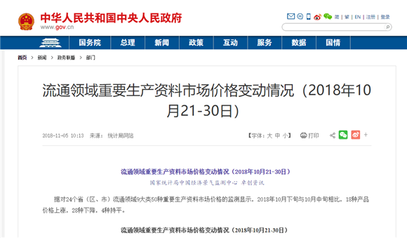 11月5日,中央人民政府網(wǎng)站發(fā)布,據(jù)對(duì)24個(gè)省(區(qū)、市)流通領(lǐng)域9大類(lèi)50種重要生產(chǎn)資料市場(chǎng)價(jià)格的監(jiān)測(cè)顯示,2018年10月下旬與10月中旬相比,18種產(chǎn)品價(jià)格上漲,28種下降,4種持平。