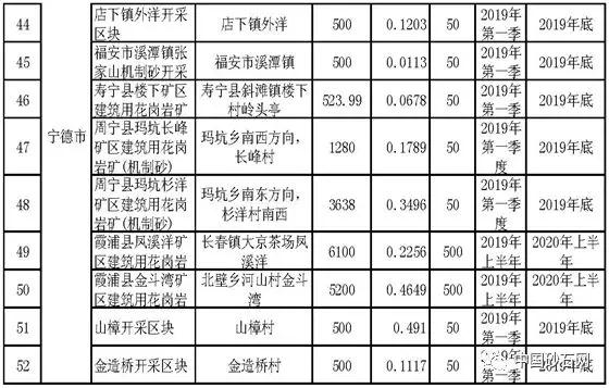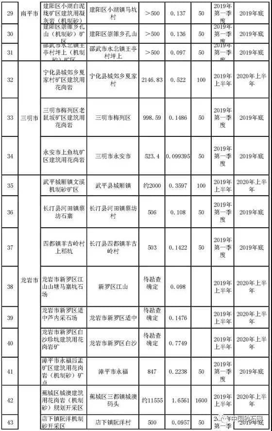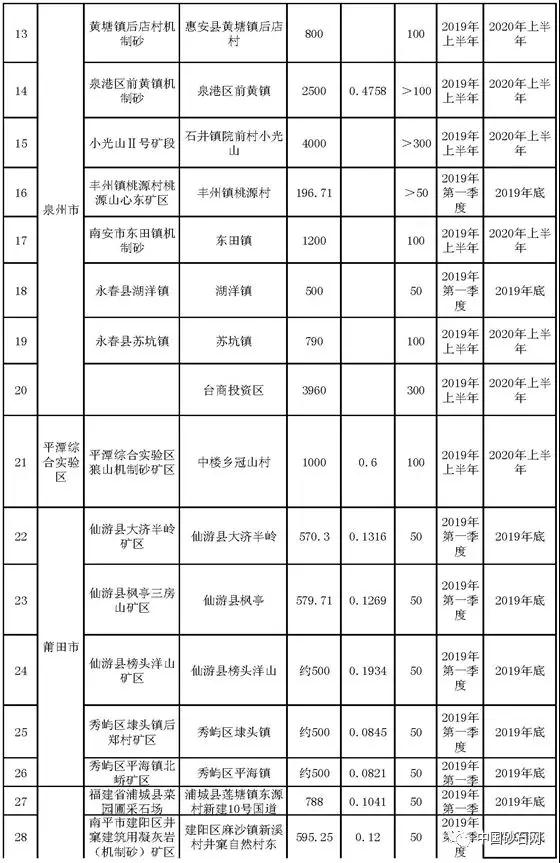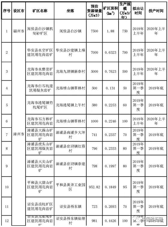 今天,《福建省國土資源廳 福建省住房和城鄉(xiāng)建設(shè)廳關(guān)于加快推進(jìn)機(jī)制砂項(xiàng)目配套礦山采礦權(quán)出讓工作的通知》在福建省自然資源廳網(wǎng)站公示。其中附件中有:《各設(shè)區(qū)市擬設(shè)機(jī)制砂項(xiàng)目配套礦山基本情況一覽表》,一共有52家機(jī)制砂礦區(qū),投產(chǎn)時(shí)間段在2019年到2020年之間。