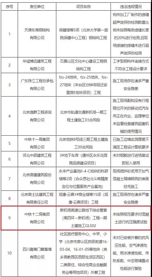 日前,北京市住房城鄉(xiāng)建設(shè)委集中通報(bào)10家安全質(zhì)量違法違規(guī)企業(yè),其中新機(jī)場高速公路地下綜合管廊(南四環(huán)~新機(jī)場)工程一期土建施工GLS02 因未按照規(guī)范要求對混凝土進(jìn)行抗壓強(qiáng)度試驗(yàn)被通報(bào),項(xiàng)目責(zé)任單位為中鐵十二局集團(tuán)有限公司。