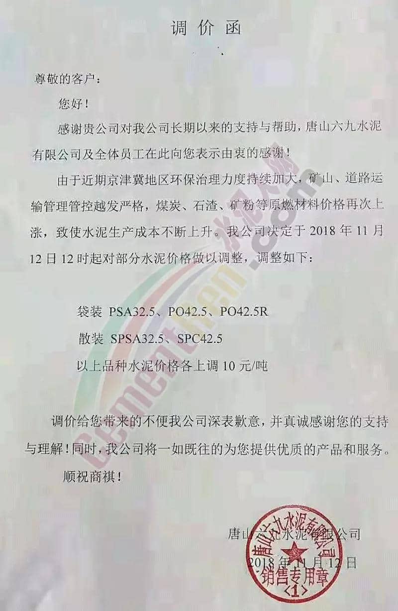 同一天唐山六九水泥有限公司也發(fā)布調(diào)價(jià)函,并表示由于近期京津冀地區(qū)環(huán)保治理力度持續(xù)加大,礦山、道路運(yùn)輸管控越發(fā)嚴(yán)格,煤炭、石渣、礦粉等原燃材料價(jià)格再次上漲,致使水泥生產(chǎn)成本不斷上升。公司決定于11月12日12時(shí)起對(duì)部分水泥價(jià)格進(jìn)行上調(diào)。其中袋裝PSA32.5、PO42.5、PO42.5R及散裝SPSA32.5、SPC42.5等標(biāo)號(hào)水泥價(jià)格各上調(diào)10元/噸。
