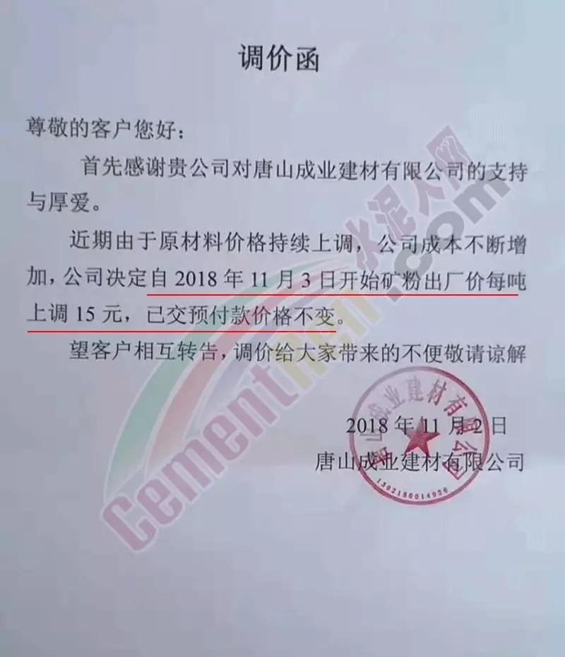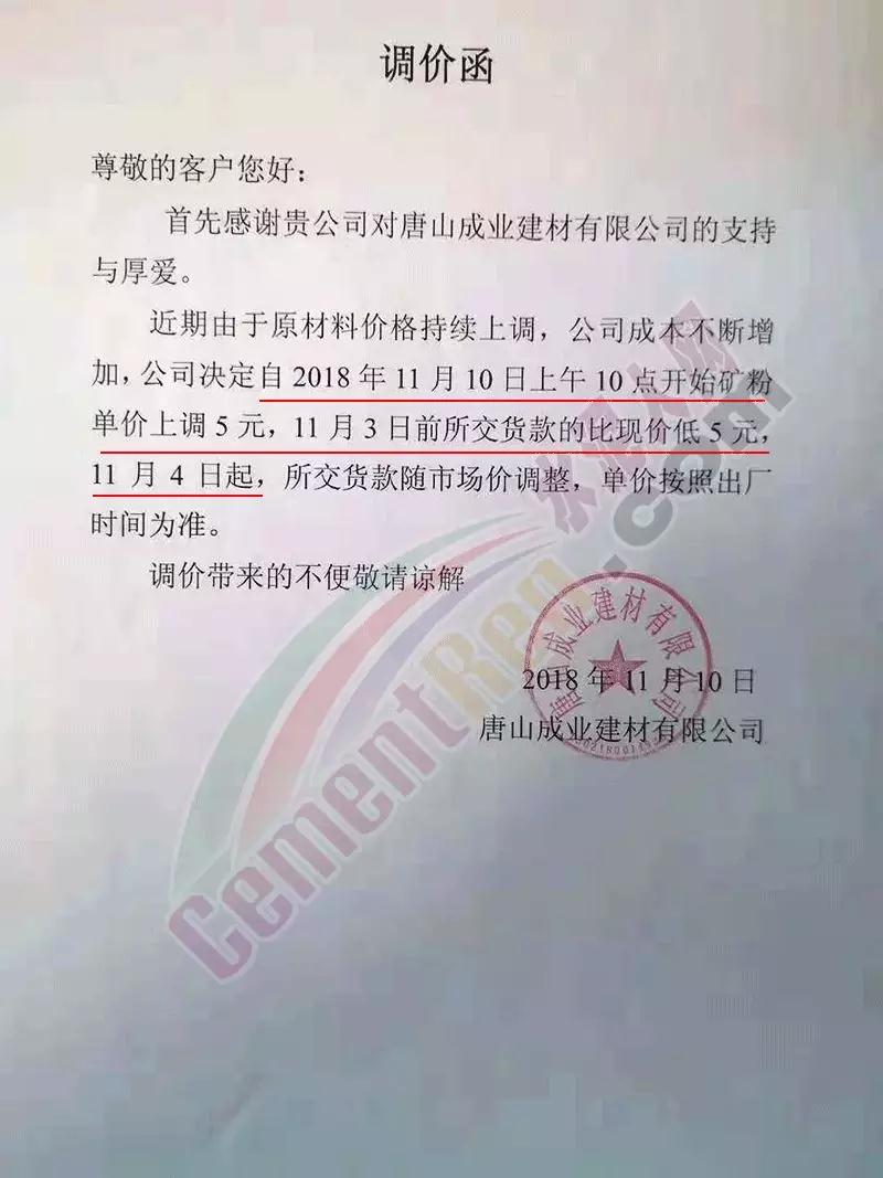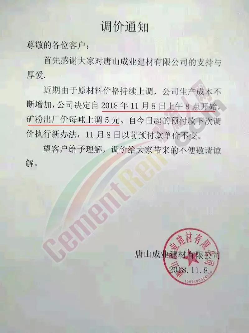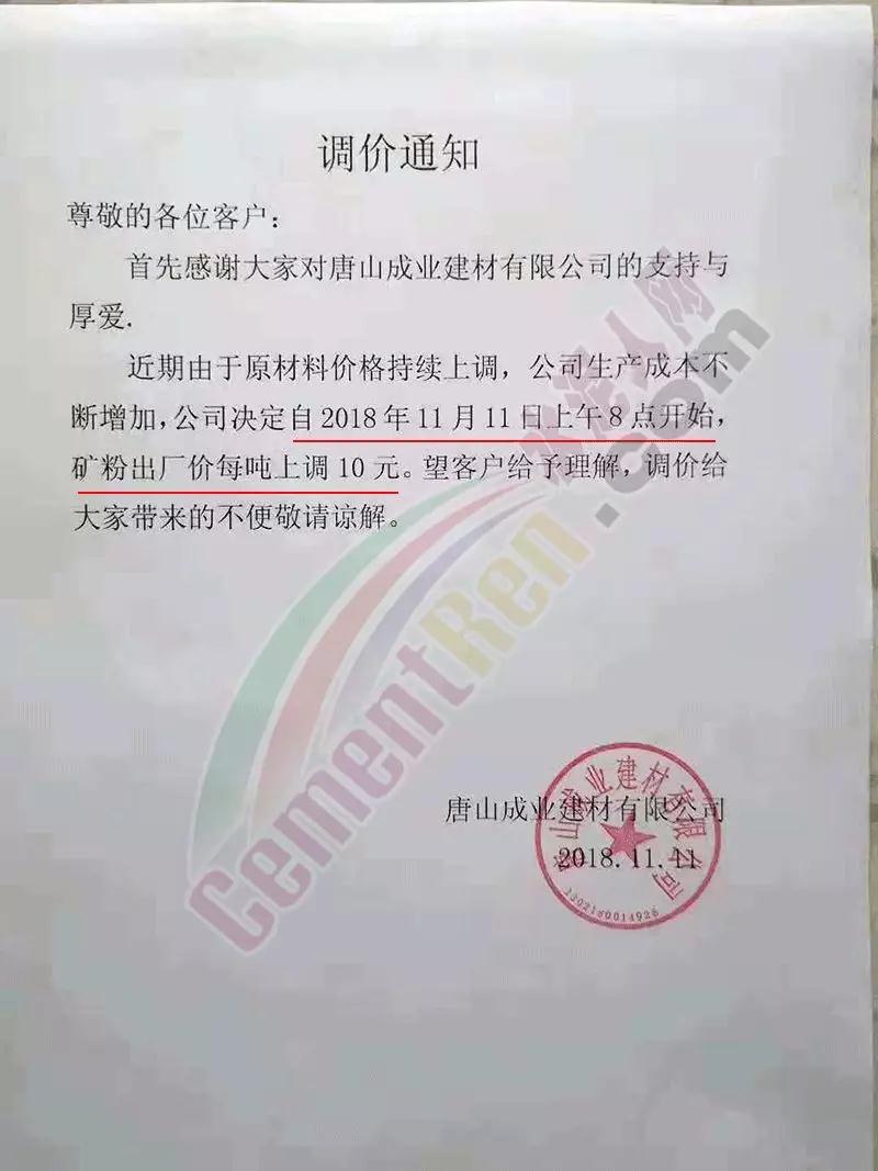 其中唐山成業(yè)建材有限公司于本月3日、8日、10日、11日已經(jīng)四次上調(diào)礦粉價(jià)格,調(diào)價(jià)通知如下: