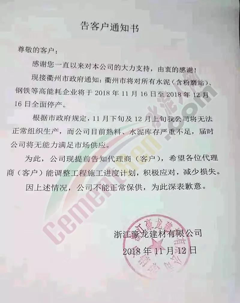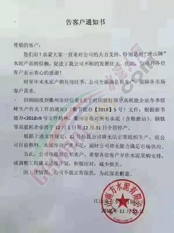 江山南方水泥有限公司發(fā)布《告客戶通知書》稱時(shí)至年末水泥產(chǎn)銷傳統(tǒng)旺季,公司全面滿負(fù)荷生產(chǎn),保障各市場(chǎng)客戶需求。但剛剛接到衢州市經(jīng)信委《關(guān)于組織做好部分高耗能企業(yè)冬季錯(cuò)峰生產(chǎn)有關(guān)工作的通知》(衢節(jié)能辦【2018】5號(hào))文件:根據(jù)浙節(jié)能力<2018>號(hào)文件精神,衢州市對(duì)所有水泥(含粉磨站)、鋼鐵等高能耗企業(yè)將于12月1日至12月31日全面停產(chǎn)。