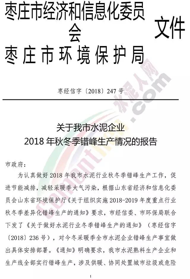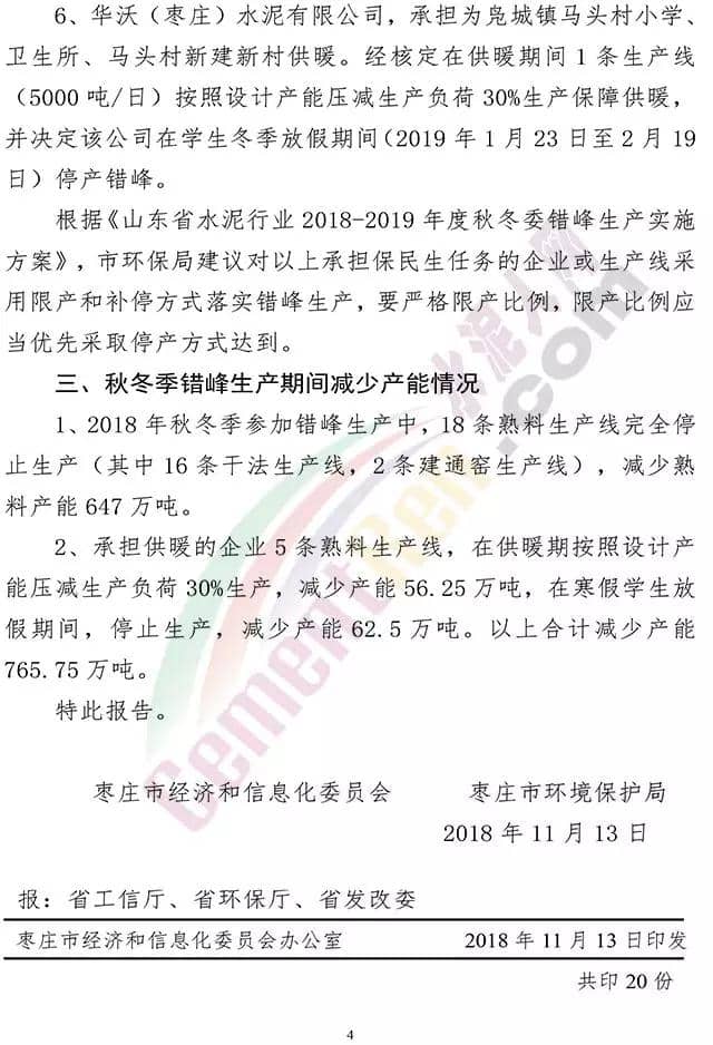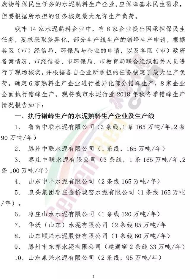 棗莊市水泥行業(yè)2018年秋冬季錯(cuò)峰生產(chǎn)情況