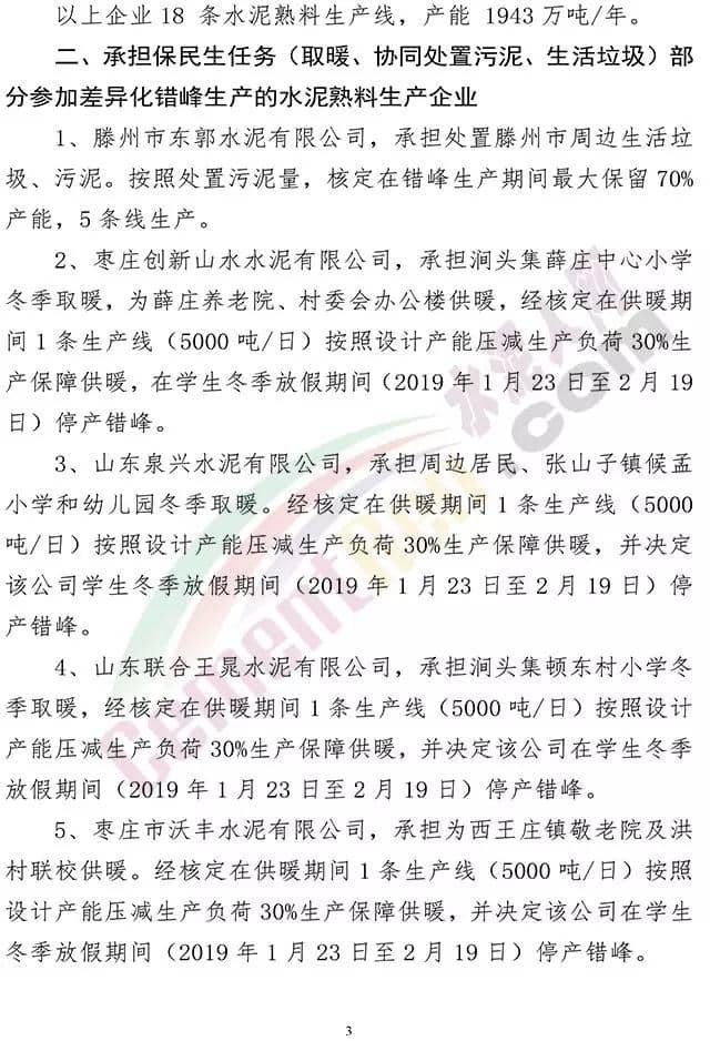 2、棗莊創(chuàng)新山水水泥有限公司,承擔(dān)澗頭集薛莊中心小學(xué)冬季取暖,為薛莊養(yǎng)老院、村委會(huì)辦公樓供暖,經(jīng)核定在供暖期間1條生產(chǎn)線(5000噸/日)按照設(shè)計(jì)產(chǎn)能壓減生產(chǎn)負(fù)荷30%生產(chǎn)保障供暖,在學(xué)生冬季放假期間(2019年1月23日至2月19日)停產(chǎn)錯(cuò)峰。