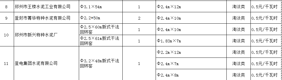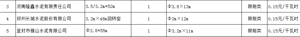 用電不加價(jià)水泥企業(yè):鄭州煤炭工業(yè)集團(tuán)龍力水泥有限責(zé)任公司、天瑞集團(tuán)鄭州水泥有限公司、中國長城鋁業(yè)有限公司水泥廠、登封中聯(lián)登電水泥有限公司、天瑞新登鄭州水泥有限公司、登封市嵩基水泥有限公司、登封市宏昌水泥有限公司、登電集團(tuán)水泥有限公司、鄭州順寶水泥股份有限公司、鄭州永華水泥有限公司、新鄭市恒發(fā)水泥廠、河南雙龍建材有限公司。