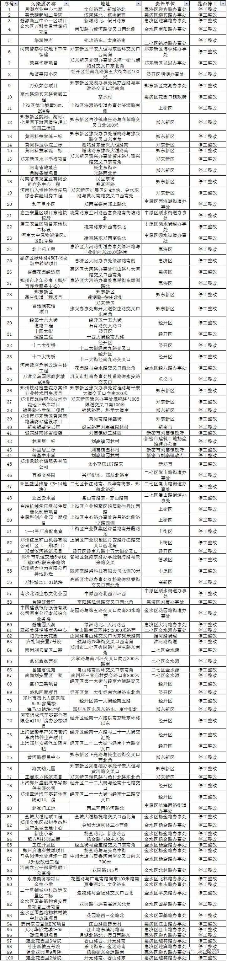 另據(jù)報道,由于未落實"八個百分之百"要求,鄭州市910個工地被停工。11月14日,鄭州市環(huán)保局公布910個被停工工地名單,以及存在的問題。