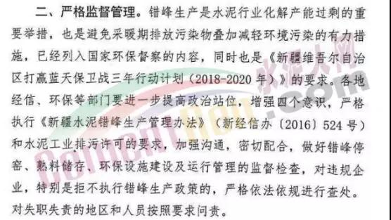 根據(jù)新疆環(huán)保廳、工信委、建設兵團環(huán)保局聯(lián)合發(fā)布的《關于2018-2019年冬季水泥錯峰生產(chǎn)的通知》相關要求,對違規(guī)企業(yè)、特別是拒不執(zhí)行錯峰生產(chǎn)政策的,嚴格依法依規(guī)進行查處。對失職失責的地區(qū)和人員按照要求問責。
