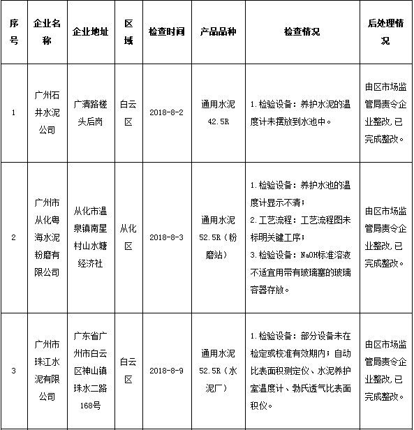 根據(jù)雙隨機(jī)檢查工作要求,現(xiàn)將空氣壓縮機(jī)、建筑用鋼材、人造板、水泥、燃?xì)馄骶?、勞保用品、音視頻設(shè)備、電線電纜(CCC)產(chǎn)品的檢查結(jié)果公布,其中,水泥生產(chǎn)企業(yè)檢查情況表如下: