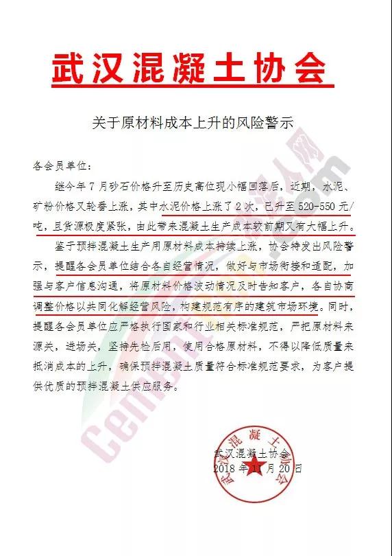 近期受水泥價格持續(xù)上漲影響,武漢混凝土協(xié)會發(fā)布預警通知:稱繼今年7月砂石價格升至歷史高位現(xiàn)小幅回落后。近期,水泥、礦粉價格又輪番上漲,其中水泥價格上漲2次,已升至520-550元/噸,且貨源極度緊張,由此帶來混凝土生產(chǎn)成本較前期又有大幅上升,鑒于預拌混凝土生產(chǎn)用原材料成本持續(xù)上漲,協(xié)會特發(fā)出風險警示提醒各會員單位結(jié)合各自經(jīng)營情況,做好與市場銜接和適配,加強與客戶信息溝通,將原材料價格波動情況及時告知客戶,各自協(xié)商調(diào)整價格以共同化解經(jīng)營風險,構(gòu)建規(guī)范有序的建筑市場環(huán)境。原文如下: